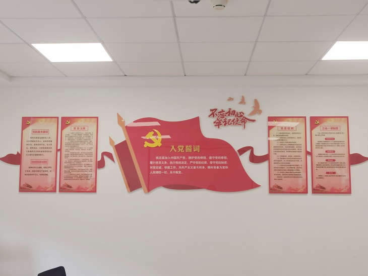 黨員活動室整體布局規(guī)范簡潔。在設(shè)置要求上,配齊桌椅等必要設(shè)施,能夠滿足黨支部全體黨員學(xué)習(xí)、會議需要;在環(huán)境布置上,合理布置黨旗、入黨誓詞、黨的基本路線、黨的四項(xiàng)基本原則、黨員的義務(wù)和權(quán)利、社會主義核心價值觀、“三會一課”制度等內(nèi)容,同時增加建設(shè)公司特色黨建品牌名稱和標(biāo)識。