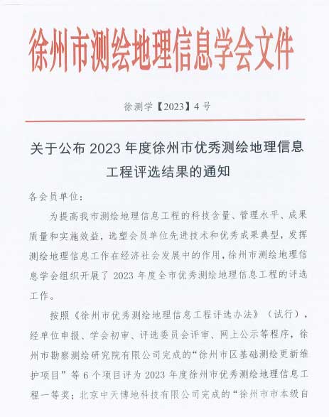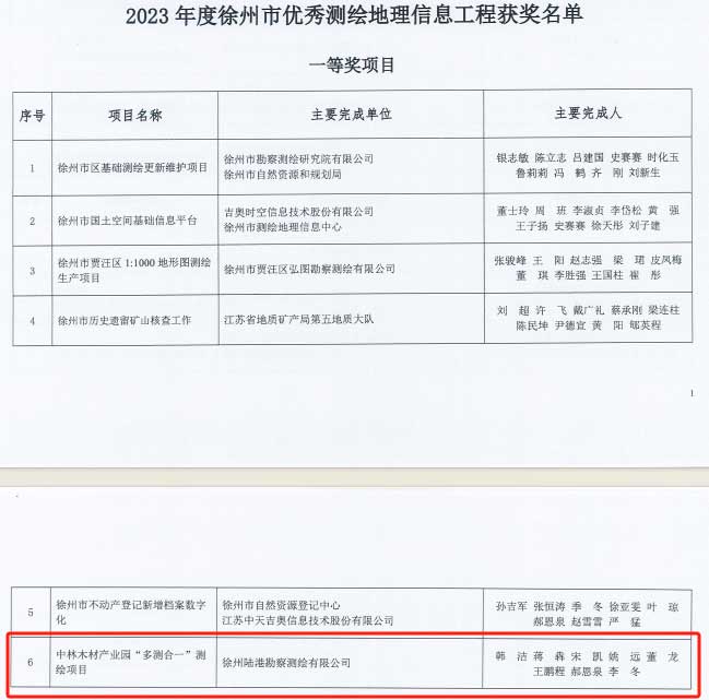 近日,從徐州市測繪地理信息學(xué)會(huì)傳來喜訊,徐州陸港勘察測繪有限公司申報(bào)的《中林木材產(chǎn)業(yè)園“多測合一”測繪項(xiàng)目》榮獲2023年度徐州市優(yōu)秀測繪地理信息工程一等獎(jiǎng)。