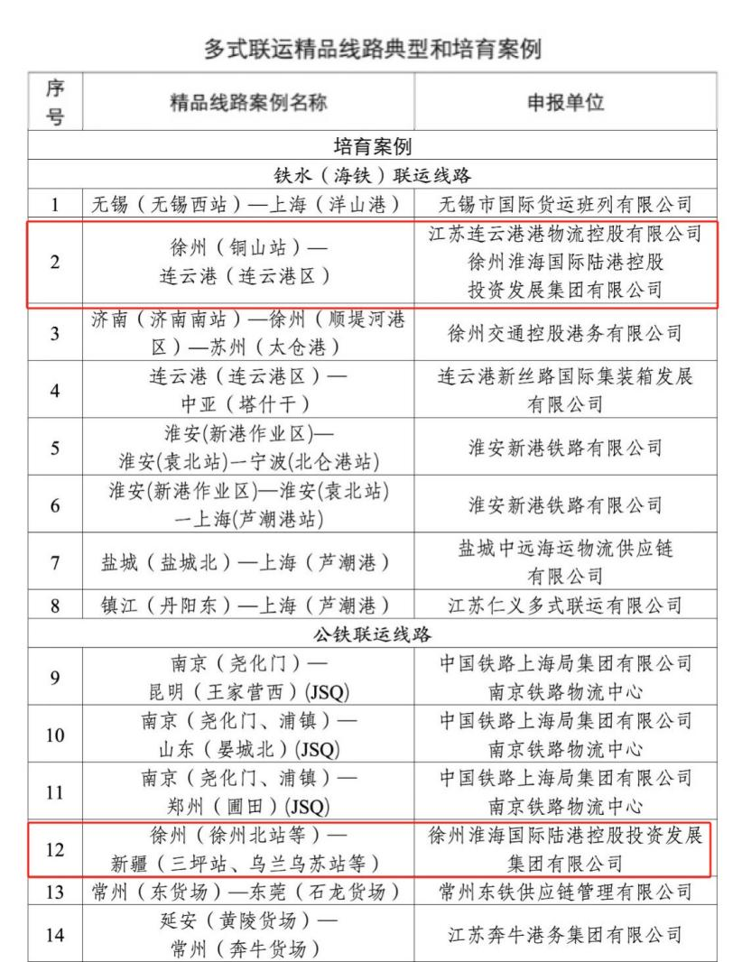 日前,省交通運(yùn)輸廳公布了多式聯(lián)運(yùn)、內(nèi)河集裝箱運(yùn)輸、中歐(亞)班列精品線路(航線)典型和培育案例,其中,由徐州淮海國(guó)際陸港控股投資發(fā)展集團(tuán)有限公司(以下簡(jiǎn)稱“陸港集團(tuán)”)獨(dú)立申報(bào)的“徐州(徐州北站等)-新疆(三坪站、烏蘭烏蘇站等)”公鐵聯(lián)運(yùn)線路、與江蘇連云港港物流控股有限公司聯(lián)合申報(bào)的“徐州(銅山站)-連云港(連云港區(qū))”鐵水(海鐵)聯(lián)運(yùn)線路兩條線路成功入選“多式聯(lián)運(yùn)精品線路培育案例”。